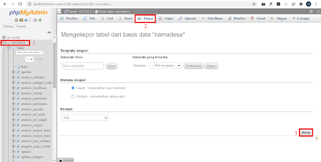 Langkah ini sama seperti sebelumnya di mode offline, jika anda sudah memiliki database sql yang sudah diisi di mode offline, silahkan anda buka terlebih dahulu database anda di mode offline --> lalu klik Ekspor --> kemudian Kirim.